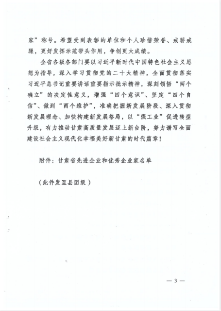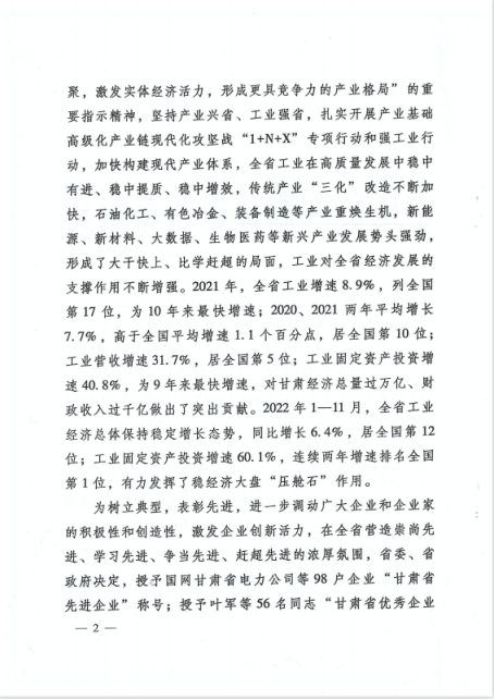 12月24日,甘肅省全省強(qiáng)工業(yè)行動(dòng)推進(jìn)大會(huì)暨先進(jìn)企業(yè)和優(yōu)秀企業(yè)家表彰大會(huì)在蘭州召開,省委書記胡昌升出席會(huì)議并講話。省委副書記、省長(zhǎng)任振鶴主持會(huì)議。會(huì)議表彰了98家先進(jìn)企業(yè)和56名優(yōu)秀企業(yè)家(獲獎(jiǎng)名單附文后),大禹節(jié)水集團(tuán)股份有限公司榮膺“甘肅省先進(jìn)企業(yè)突出貢獻(xiàn)獎(jiǎng)”,董事長(zhǎng)王浩宇榮膺“甘肅省優(yōu)秀企業(yè)家”稱號(hào)。
