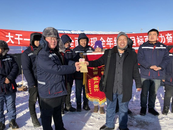 王光敏代表集團(tuán)董事會(huì)現(xiàn)場(chǎng)宣讀了董事長(zhǎng)致牙克石項(xiàng)目一線員工的親筆慰問(wèn)信,代表大禹節(jié)水董事會(huì)授予呼倫貝爾牙克石項(xiàng)目部“優(yōu)質(zhì)工程,大禹精神;責(zé)任擔(dān)當(dāng),客戶嘉許”錦旗一面,并送去了5000元慰問(wèn)金及慰問(wèn)品。