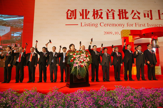 2009年10月30日上午8點30分,創(chuàng)業(yè)板上市儀式開始,深交所理事長陳東征、央行與證監(jiān)會領(lǐng)導先后致辭。