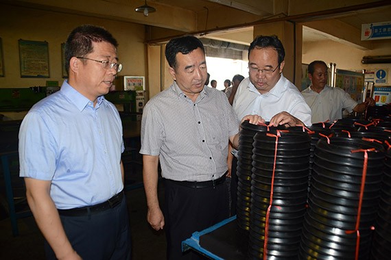 水利部調(diào)研組首先來到大禹節(jié)水集團展廳,從公司發(fā)展歷程、企業(yè)文化、榮譽資質(zhì)、國際交流與考察等方面對大禹節(jié)水集團進行了全面了解,大禹節(jié)水集團董事長王棟向調(diào)研組一行進行了詳細介紹;隨后,調(diào)研組深入公司滴灌車間、現(xiàn)代化灌溉設(shè)備裝備中心及管件車間生產(chǎn)一線,邊走邊看,邊聽邊問,不時與集團公司董事長王棟等公司陪同人員交流,了解公司生產(chǎn)經(jīng)營情況、取得的成績及技術(shù)創(chuàng)新等相關(guān)情況,董事長王棟一一進行了介紹和解答。大禹節(jié)水集團產(chǎn)品種類的全面性、研發(fā)銷售設(shè)計施工一體化及嚴格的產(chǎn)品質(zhì)量檢驗流程獲得了調(diào)研組的充分肯定。