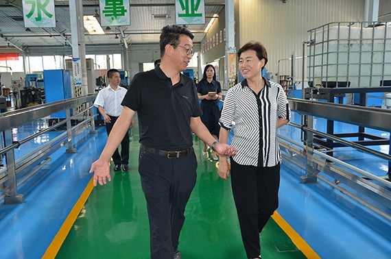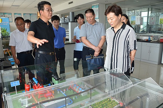 在王沖等公司領(lǐng)導(dǎo)的陪同下,徐繼珍副區(qū)長一行先后來到公司生產(chǎn)車間、試驗田、實驗室實地調(diào)研。詳細了解了公司發(fā)展歷程、榮譽資質(zhì)、國際業(yè)務(wù)開展等基本情況,現(xiàn)場查看了壓力補償式滴灌管等相關(guān)產(chǎn)品生產(chǎn)工藝。在公司試驗基地,徐繼珍副區(qū)長一行認真聽取了王沖就過濾系統(tǒng)、噴灌系統(tǒng)及污水處理設(shè)備與產(chǎn)品的有關(guān)介紹。在公司檢測實驗室,徐繼珍副區(qū)長對公司智慧水務(wù)產(chǎn)業(yè)的發(fā)展饒有興趣,駐足現(xiàn)場查看智能化田間管理灌溉模型系統(tǒng),并使用手機進行操作演示。
