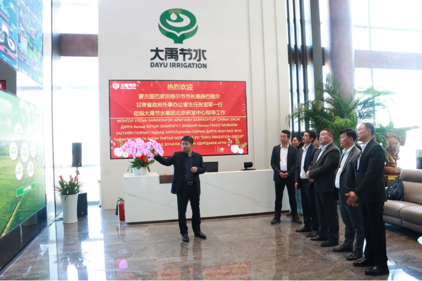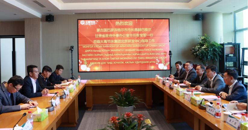 10月18日上午,蒙古國(guó)巴彥洪格爾市市長(zhǎng)恩赫巴雅爾(Enkhbayar)、巴彥洪格爾市呼拉爾公民代表主席巴圖才仁(Battseren)、巴彥洪格爾輸電配電公司執(zhí)行董事烏蘭巴雅爾(Ulambayar);甘肅省政府外事辦黨組書記、辦公室主任張寶軍,省政府外事辦黨組成員、對(duì)外友協(xié)專職副會(huì)長(zhǎng)梁保平,省對(duì)外友協(xié)友城工作處處長(zhǎng)康廣宏一行領(lǐng)導(dǎo)蒞臨大禹節(jié)水集團(tuán)北京研發(fā)中心考察座談,大禹節(jié)水集團(tuán)黨委書記王沖等陪同。