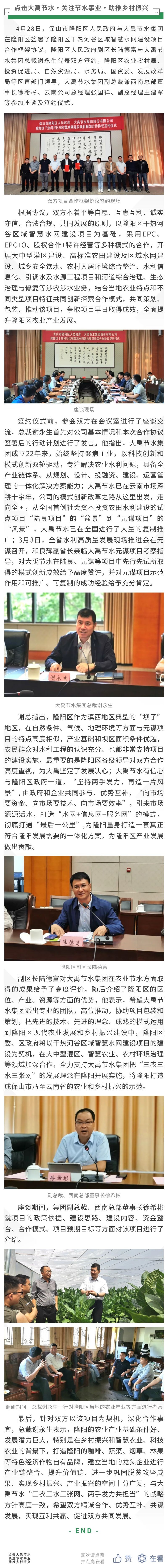 大禹動(dòng)態(tài)| 保山市隆陽(yáng)區(qū)人民政府與大禹節(jié)水集團(tuán)簽署項(xiàng)目合作框架協(xié)議