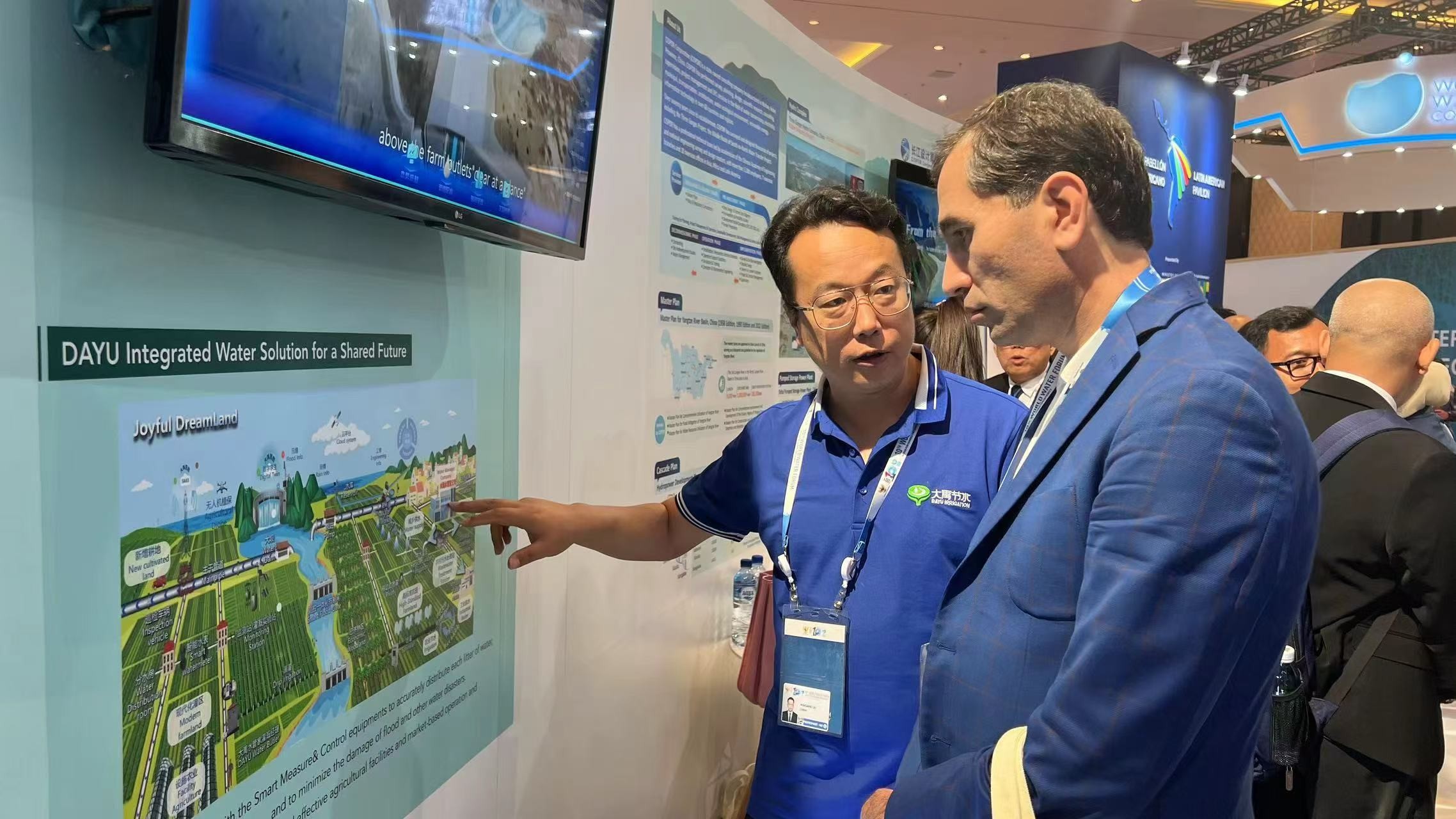 論壇同期舉行了世界水展,中國(guó)館位于國(guó)家館主館區(qū),集中展現(xiàn)了中國(guó)水利工程、技術(shù)等方面的卓越成就。大禹節(jié)水作為行業(yè)龍頭企業(yè),展區(qū)內(nèi)人潮涌動(dòng),熱鬧非凡,大禹節(jié)水一體化解決方案成為參觀者駐足的焦點(diǎn)。期間,水利部部長(zhǎng)李國(guó)英蒞臨大禹節(jié)水展位參觀,聽取集團(tuán)董事長(zhǎng)王浩宇對(duì)公司業(yè)務(wù)及項(xiàng)目等情況的匯報(bào)。