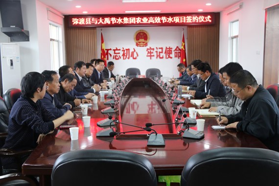 簽字儀式前,雙方在彌渡縣水務局就合作事宜進行了友好會談。大禹節(jié)水集團股份有限公司總裁謝永生向彌渡縣水務局領(lǐng)導介紹了大禹節(jié)水集團的戰(zhàn)略規(guī)劃和業(yè)務發(fā)展情況,重點介紹了公司在云南農(nóng)田水利建設(shè)及全國PPP項目等推廣情況,以及大禹節(jié)水集團公司在云南省農(nóng)田水利改革中社會資本參與建設(shè)受到中央、省委領(lǐng)導關(guān)注等情況,希望通過高效節(jié)水灌溉引入社會資本投資彌渡縣農(nóng)田水利工程建設(shè),為彌渡縣發(fā)揮反季蔬菜優(yōu)勢、產(chǎn)業(yè)結(jié)構(gòu)優(yōu)化、農(nóng)民脫貧致富提供水利基礎(chǔ)設(shè)施方面的保障。