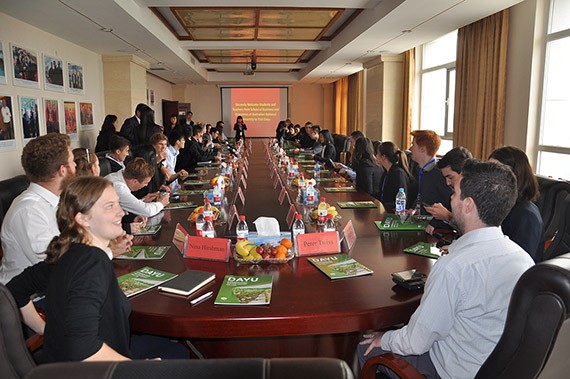 2017年4月10日下午,清華大學(xué)繼續(xù)教育學(xué)院國際教育部項(xiàng)目總監(jiān)郝娟娣、項(xiàng)目經(jīng)理顧明及澳大利亞國立大學(xué)商業(yè)與經(jīng)濟(jì)學(xué)院師生一行30人到大禹節(jié)水集團(tuán)公司考察交流。大禹節(jié)水集團(tuán)公司黨委書記、副董事長王沖、風(fēng)控總監(jiān)王云、天津公司總經(jīng)理張學(xué)雙、常務(wù)副總潘鈺、大禹研究院副院長戰(zhàn)國隆等公司領(lǐng)導(dǎo)及科技公司、研究院全體員工陪同考察。