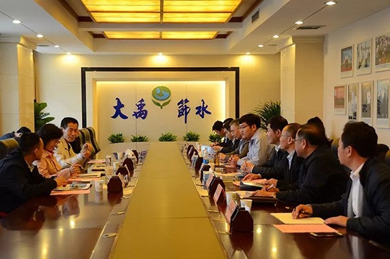 現(xiàn)場考察結束后,雙方進行了座談交流。大禹節(jié)水集團董事長王浩宇對山西水務投資集團領導一行蒞臨公司考察表示熱烈歡迎。王浩宇就公司基本情況及八大業(yè)務板塊進行了介紹,王浩宇表示,大禹節(jié)水集團始終以農和水為中心,形成了以“農業(yè)高效節(jié)水、農民安全飲水、農村污水處理”的產業(yè)格局,實現(xiàn)了全產業(yè)鏈覆蓋并取得了良好的社會效應。重點介紹了公司在“三農三水”方面取得的成績及PPP項目模式在全國的推廣建設情況。王浩宇表示,大禹節(jié)水集團愿與山西水務投資集團強強聯(lián)合,充分發(fā)揮雙方資源優(yōu)勢,互利共贏,共同開發(fā)山西水務事業(yè),為使農業(yè)更智慧、農村更美好、農民更幸福做出應有的貢獻。