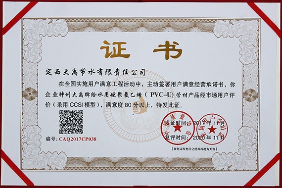 定西大禹節(jié)水有限責(zé)任公司成立于2005年,公司發(fā)展至今已成為節(jié)水灌溉產(chǎn)品的研發(fā)、制造、銷售與節(jié)水灌溉工程設(shè)計、施工、服務(wù)為一體的專業(yè)化節(jié)水灌溉工程系統(tǒng)提供商。公司一直堅持質(zhì)量和服務(wù)是企業(yè)的生命線,已建立的質(zhì)量、環(huán)境、和職業(yè)健康安全管理體手冊和程序文件,是在確保公司產(chǎn)品和運作滿足顧客需求、公眾期望和員工需求,實現(xiàn)良好的質(zhì)量、環(huán)境和職業(yè)健康安全效益,提升公司核心競爭力,實現(xiàn)規(guī)范操作而建立的"三合一"管理體系。在"三合一"管理體系運行良好的同時,公司長期不懈注重產(chǎn)品質(zhì)量的提升,先后申報取得隴西縣人民政府頒發(fā)的 《隴西縣質(zhì)量獎》證書和甘肅省質(zhì)量協(xié)會評價頒發(fā)的"PVC/PE管材甘肅省用戶滿意產(chǎn)品"證書。在2017年的客戶滿意指數(shù)測評報告中顯示,公司的產(chǎn)品客戶滿意指數(shù)為89.9,得到了用戶的普遍認(rèn)可。