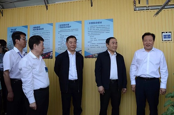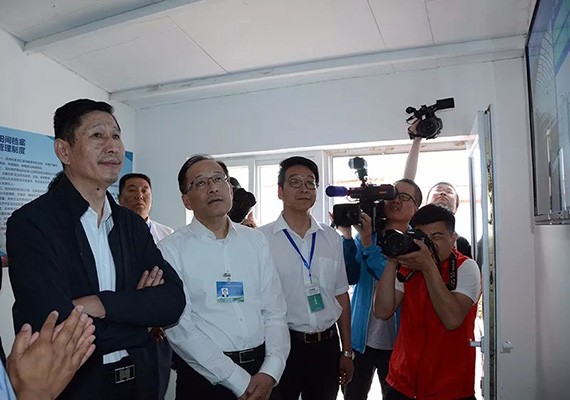 ▲農(nóng)業(yè)農(nóng)村部總農(nóng)藝師馬愛(ài)國(guó)(左一)天津市農(nóng)村工作委員會(huì)主任、黨委書(shū)記沈欣(左二)大禹節(jié)水集團(tuán)黨委書(shū)記王沖(左三)觀看溫室信息管理系統(tǒng)
