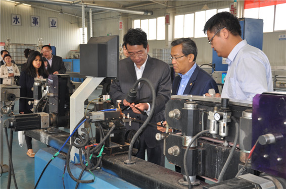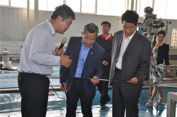 天津大禹節(jié)水科技有限公司總經(jīng)理王浩宇向柬埔寨副首相一行介紹滴灌帶生產(chǎn)工藝