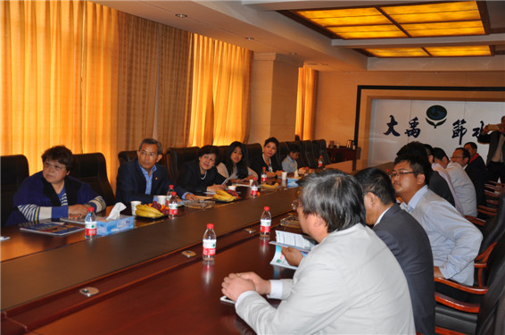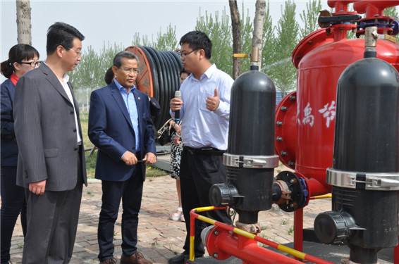 天津大禹節(jié)水科技有限公司總經(jīng)理王浩宇向柬埔寨副首相及王室一行介紹大禹節(jié)水公司自主研發(fā)生產(chǎn)的自動化施肥過濾器設備