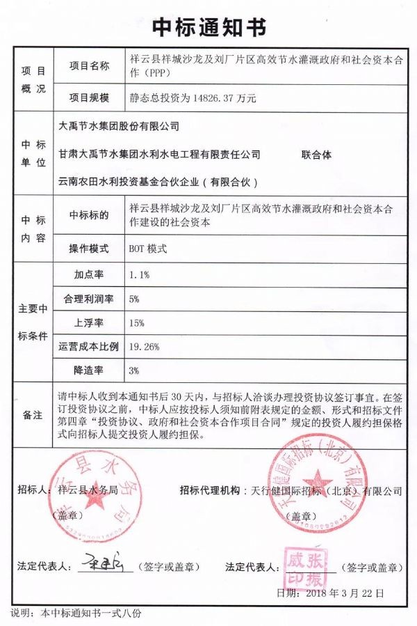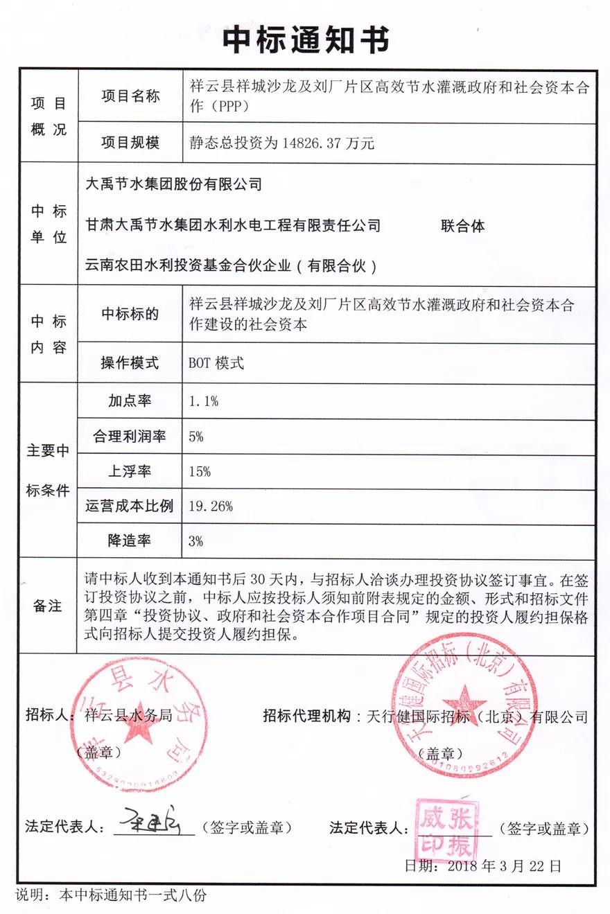 近日,大禹節(jié)水集團(tuán)股份有限公司收到云南省大理州祥云縣祥城沙龍及劉廠片區(qū)高效節(jié)水灌溉政府和社會(huì)資本合作(PPP)項(xiàng)目中標(biāo)通知書,成功成為項(xiàng)目中標(biāo)社會(huì)資本方。項(xiàng)目靜態(tài)總投資為14,826.37萬元,項(xiàng)目合作期為20.58年,其中建設(shè)期0.58年,運(yùn)營期20年。項(xiàng)目位于祥云縣祥城鎮(zhèn)、沙龍鎮(zhèn)及劉廠鎮(zhèn),合計(jì)實(shí)施高效節(jié)水灌溉面積5萬畝,其中:祥城沙龍片區(qū)灌溉面積3.4萬畝;劉廠片區(qū)灌溉面積1.6萬畝。工程內(nèi)容包括取水工程、輸水工程、配水工程、田間工程及自動(dòng)化工程。
