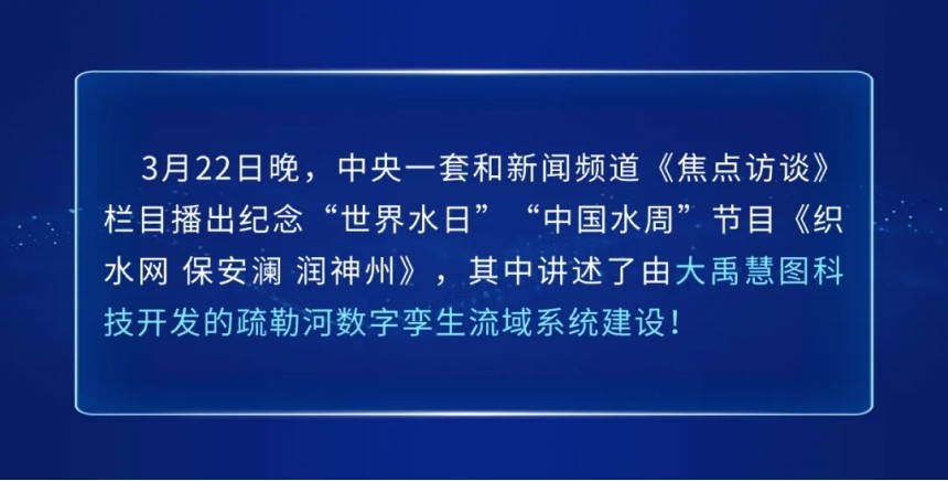 此前,央視新聞?lì)l道以“數(shù)字孿生技術(shù)助力134萬畝農(nóng)田暢飲智慧水"為題對(duì)大禹慧圖科技開發(fā)的疏勒河數(shù)字孿生系統(tǒng)進(jìn)行了報(bào)道。