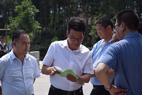 ▲水利部副部長田學斌(右一)與集團公司黨委書記王沖(右三)在重慶巫溪縣調(diào)研現(xiàn)場
