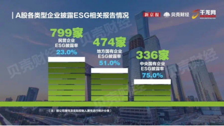 據(jù)貝殼財經(jīng)統(tǒng)計,A股共有1758家公司披露2022年ESG報告(含社會責任報告等多種類型),其中民營企業(yè)有799家,占全部披露企業(yè)的45.45%,但民營企業(yè)披露ESG報告的比例僅為23%,而地方國有企業(yè)、中央國有企業(yè)的披露比率則分別為51%、75%。