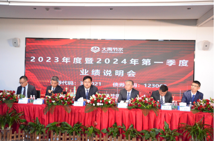 4月30日,大禹節(jié)水集團(tuán)股份有限公司(以下簡稱“大禹節(jié)水”)2023年度暨2024年第一季度業(yè)績說明會在北京研發(fā)中心召開。集團(tuán)董事長王浩宇,獨立董事何文盛,首席科學(xué)家、研究院院長高占義,副總裁、董事會秘書陳靜,副總裁、財務(wù)負(fù)責(zé)人宋金彥,以及保薦代表人張貴陽等領(lǐng)導(dǎo)嘉賓出席會議。會上,董事會秘書對2023年度及2024年第一季度的經(jīng)營情況做了匯報,與會領(lǐng)導(dǎo)、嘉賓對投資人關(guān)心的問題進(jìn)行了現(xiàn)場解答。