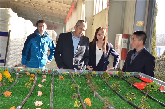 以色列美滋公司亞洲區(qū)市場經(jīng)理Tzur Harel先生在滴灌管(帶)車間參觀滴灌實(shí)驗(yàn)系統(tǒng)