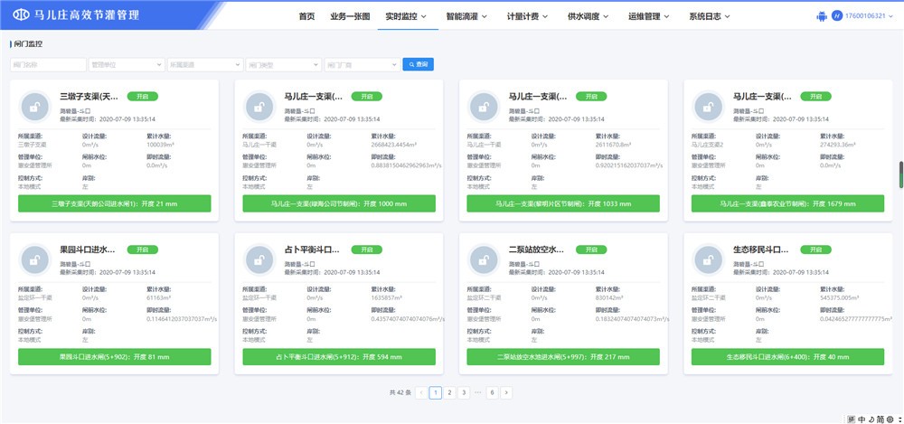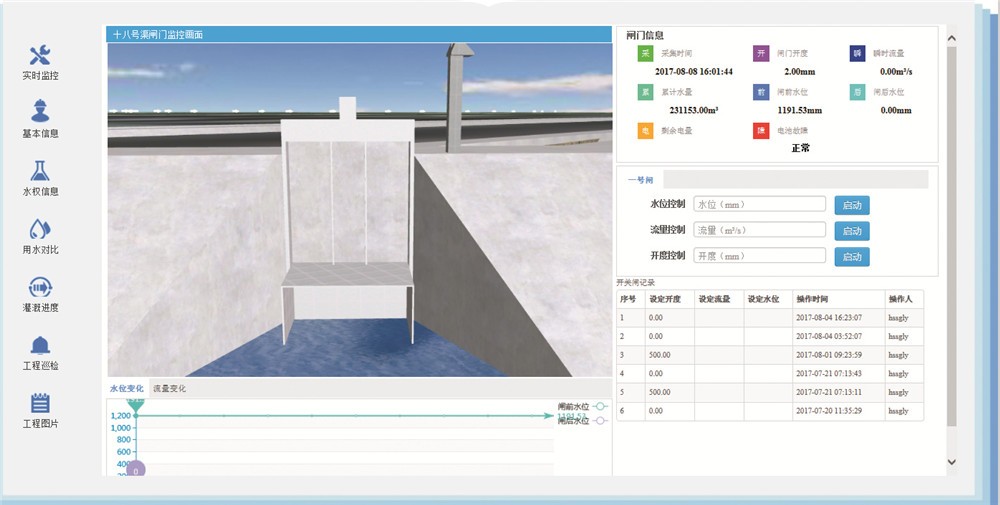 系統(tǒng)基于一工程一檔案,一渠一檔案以及一協(xié)會(huì)一檔案的邏輯進(jìn)行建設(shè),基于不同維度查詢所有相關(guān)信息。如點(diǎn)擊閘門節(jié)點(diǎn),可對(duì)閘門進(jìn)行遠(yuǎn)程實(shí)時(shí)監(jiān)控和查閱相關(guān)信息,實(shí)時(shí)監(jiān)控包括:閘門開度、實(shí)時(shí)流量、累計(jì)水量、水位、遠(yuǎn)程控制。
