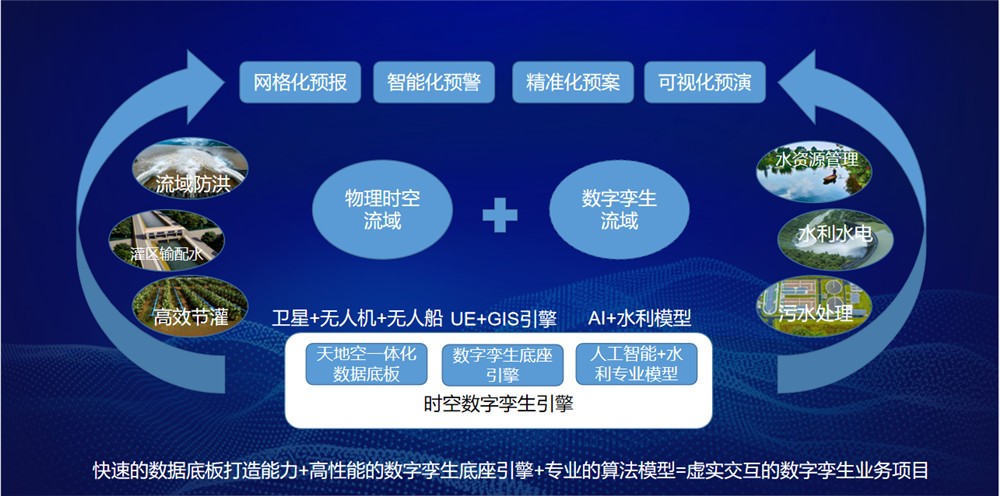 基于空天地一體化的數(shù)據(jù)底板、高效渲染、場景靈活配置的數(shù)字孿生底座引擎以及智能專業(yè)算法模型,生成虛實交互、協(xié)同映射的流域數(shù)字孿生工程,實現(xiàn)流域業(yè)務(wù)的網(wǎng)格化預(yù)報、智能化預(yù)警、精準(zhǔn)化預(yù)案、可視化預(yù)演。